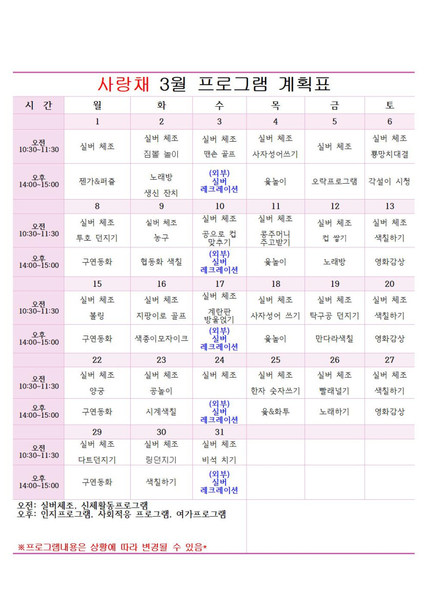 2021년 03월 식단표 및 프로그램계획표 페이지 정보 작성자 관리자 댓글 0건 조회 43회 작성일 2021-03-01 본문 2021년 03월 식단표 및 프로그램계획표 목록 목록 이전글2021년 04월 식단표 및 프로그램계획표 23.08.13 다음글2021년 02월 식단표 및 프로그램계획표 23.08.13 댓글 0 댓글목록 등록된 댓글이 없습니다.