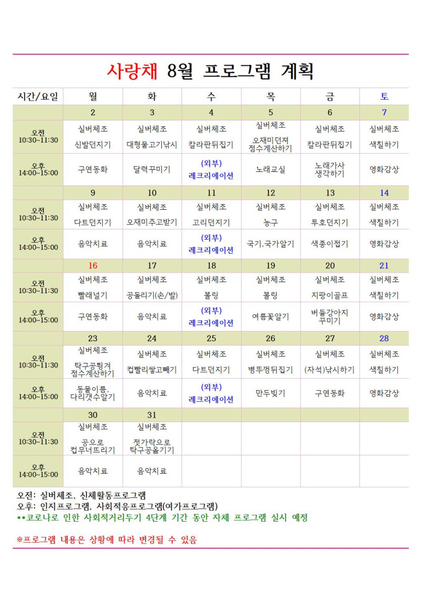 2021년 08월 식단표 및 프로그램계획표 페이지 정보 작성자 관리자 댓글 0건 조회 39회 작성일 2021-08-02 본문 2021년 08월 식단표 및 프로그램계획표 목록 목록 이전글2021년 09월 식단표 및 프로그램계획표 23.08.13 다음글2021년 07월 식단표 및 프로그램계획표 23.08.13 댓글 0 댓글목록 등록된 댓글이 없습니다.