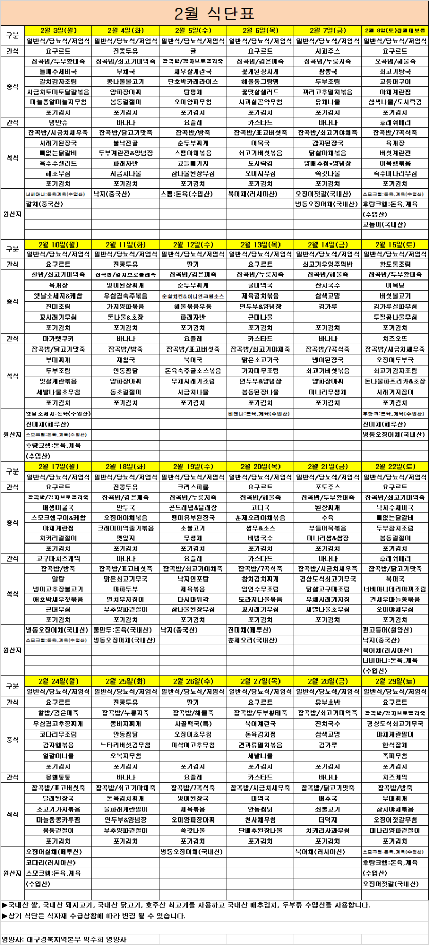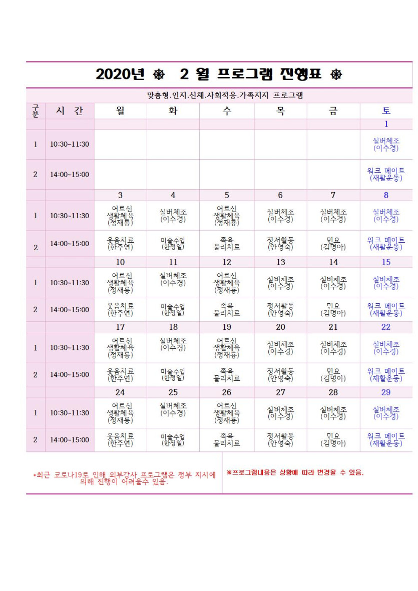2020년 2월 식단표 및 프로그램계획표 페이지 정보 작성자 관리자 댓글 0건 조회 79회 작성일 2020-02-01 본문 2020년 2월 식단표 및 프로그램계획표 목록 목록 이전글2020년 3월 식단표 및 프로그램계획표 22.11.17 댓글 0 댓글목록 등록된 댓글이 없습니다.