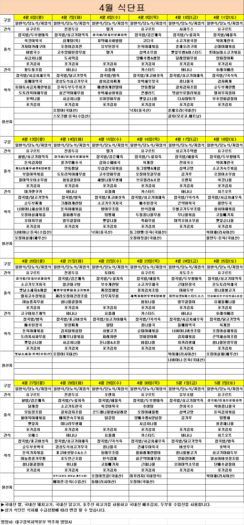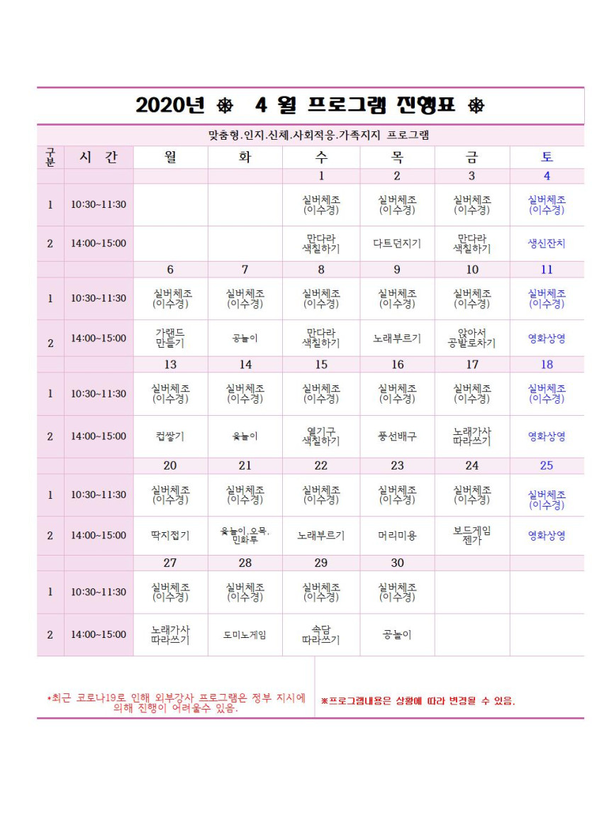 2020년 4월 식단표 및 프로그램계획표 페이지 정보 작성자 관리자 댓글 0건 조회 37회 작성일 2020-04-01 본문 2020년 4월 식단표 및 프로그램계획표 목록 목록 이전글2020년 5월 식단표 및 프로그램계획표 23.08.13 다음글2020년 3월 식단표 및 프로그램계획표 22.11.17 댓글 0 댓글목록 등록된 댓글이 없습니다.