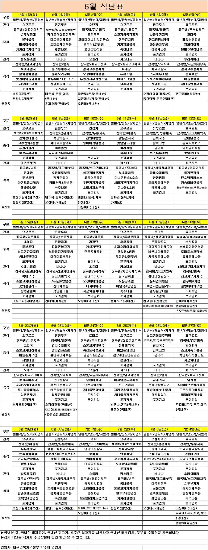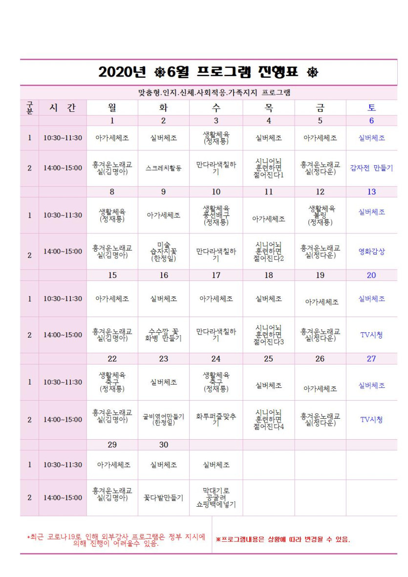 2020년 6월 식단표 및 프로그램계획표 페이지 정보 작성자 관리자 댓글 0건 조회 35회 작성일 2020-06-01 본문 2020년 6월 식단표 및 프로그램계획표 목록 목록 이전글2020년 7월 식단표 및 프로그램계획표 23.08.13 다음글2020년 5월 식단표 및 프로그램계획표 23.08.13 댓글 0 댓글목록 등록된 댓글이 없습니다.
