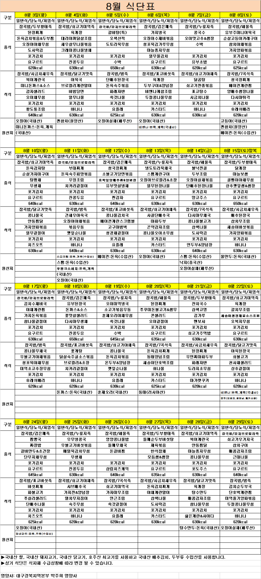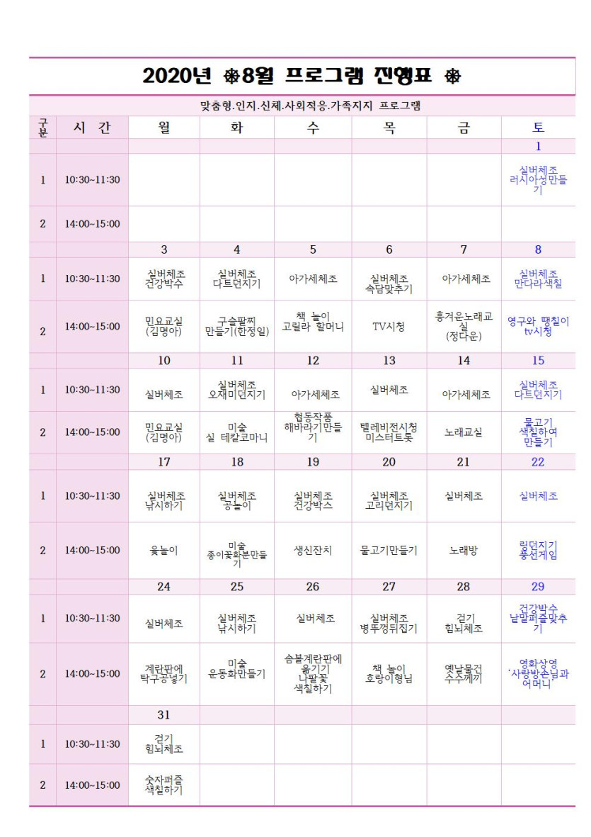 2020년 8월 식단표 및 프로그램계획표 페이지 정보 작성자 관리자 댓글 0건 조회 37회 작성일 2020-08-01 본문 2020년 8월 식단표 및 프로그램계획표 목록 목록 이전글2020년 9월 식단표 및 프로그램계획표 23.08.13 다음글2020년 7월 식단표 및 프로그램계획표 23.08.13 댓글 0 댓글목록 등록된 댓글이 없습니다.