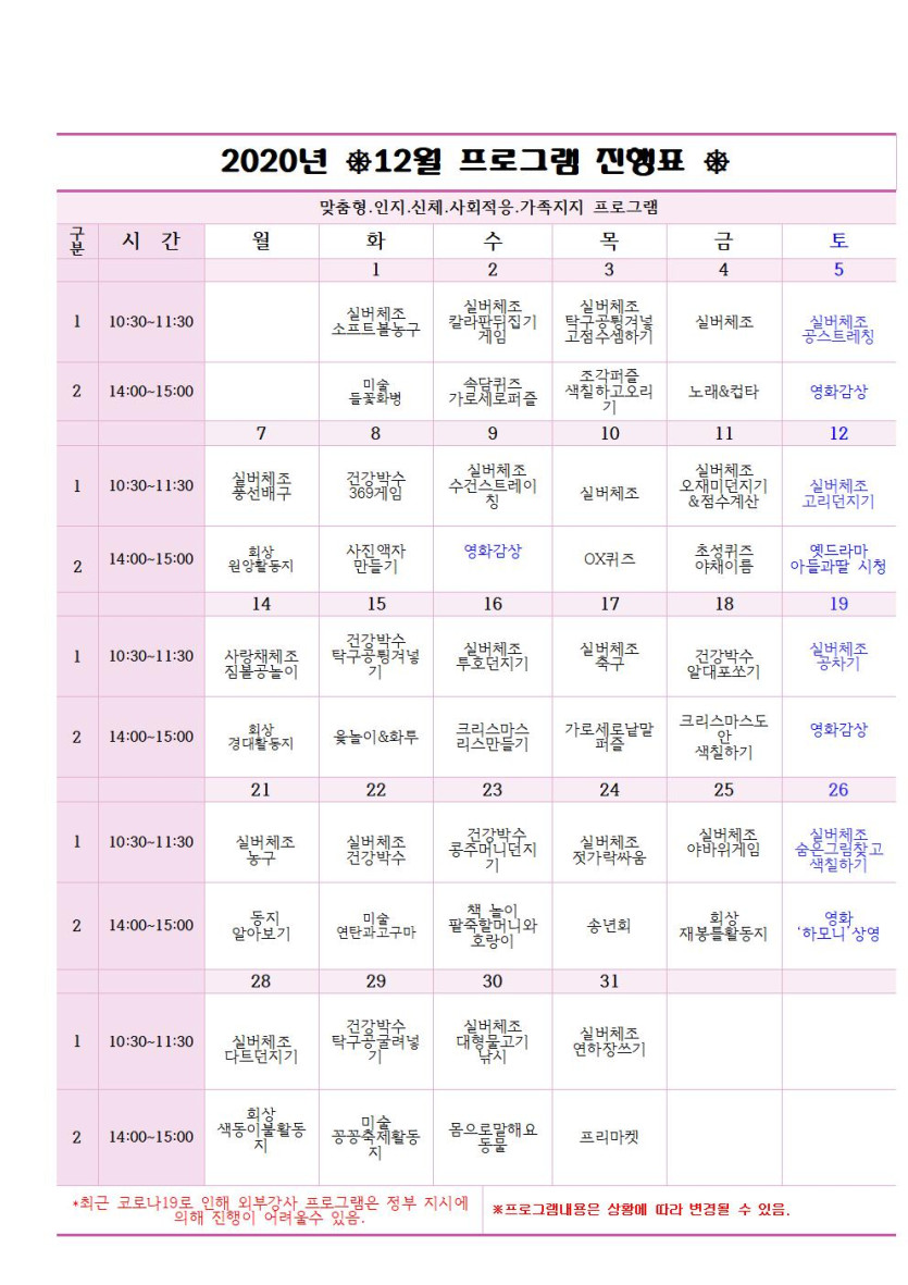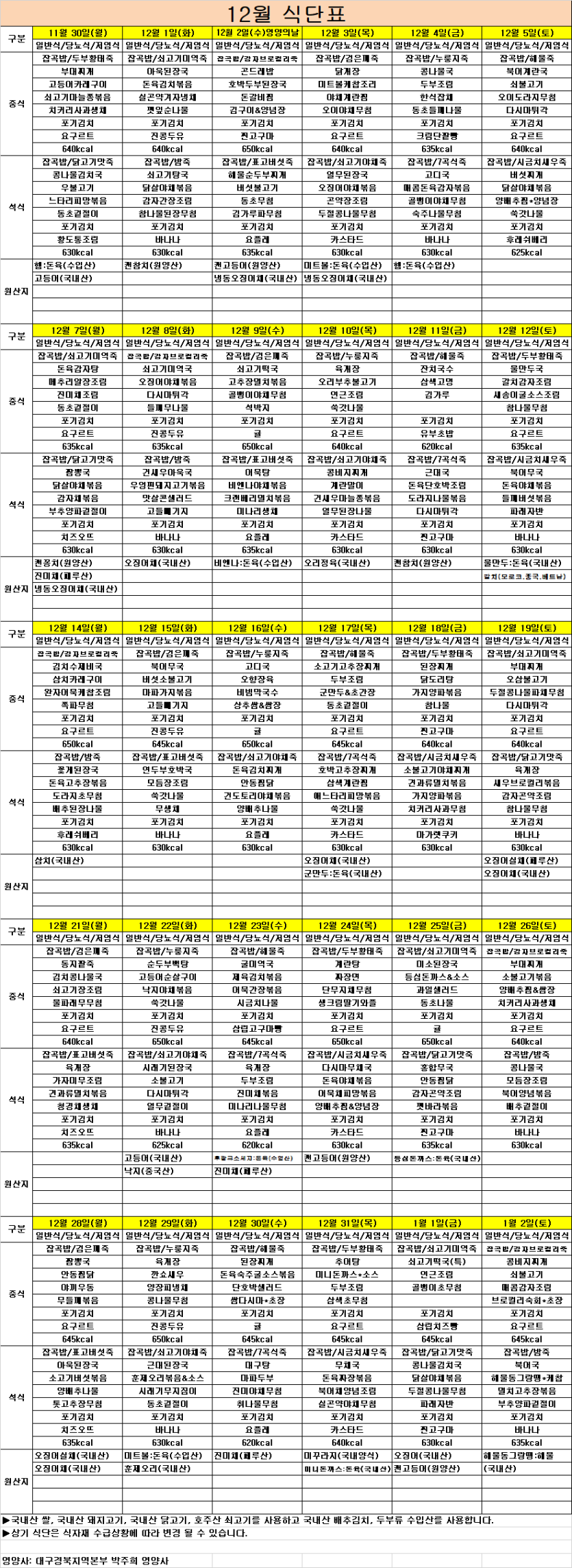2020년 12월 식단표 및 프로그램계획표 페이지 정보 작성자 관리자 댓글 0건 조회 44회 작성일 2020-12-01 본문 2020년 12월 식단표 및 프로그램계획표 목록 목록 이전글2021년 01월 식단표 및 프로그램계획표 23.08.13 다음글2020년 11월 식단표 및 프로그램계획표 23.08.13 댓글 0 댓글목록 등록된 댓글이 없습니다.