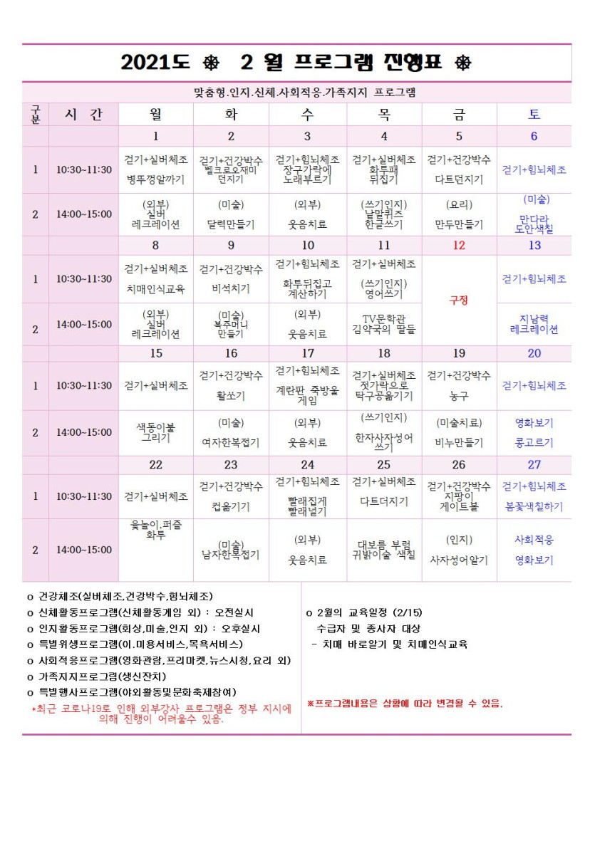 2021년 02월 식단표 및 프로그램계획표 페이지 정보 작성자 관리자 댓글 0건 조회 46회 작성일 2021-02-01 본문 2021년 02월 식단표 및 프로그램계획표 목록 목록 이전글2021년 03월 식단표 및 프로그램계획표 23.08.13 다음글2021년 01월 식단표 및 프로그램계획표 23.08.13 댓글 0 댓글목록 등록된 댓글이 없습니다.