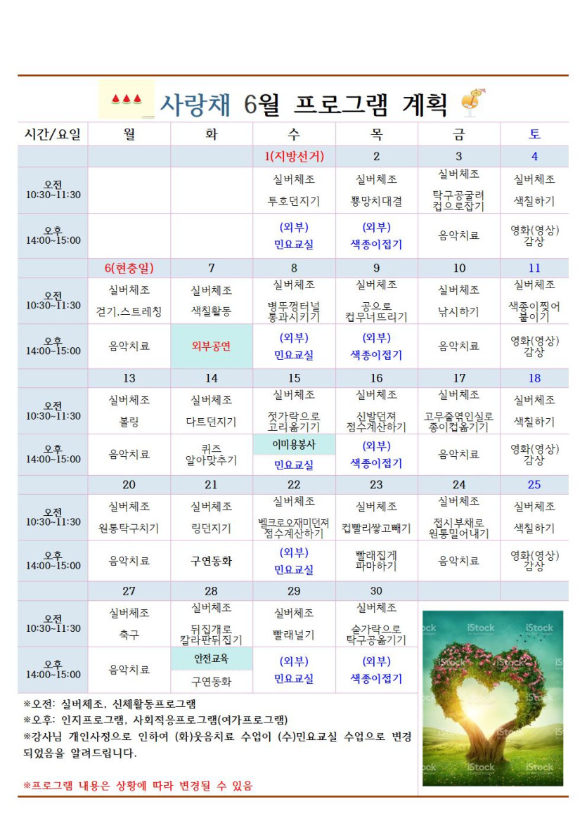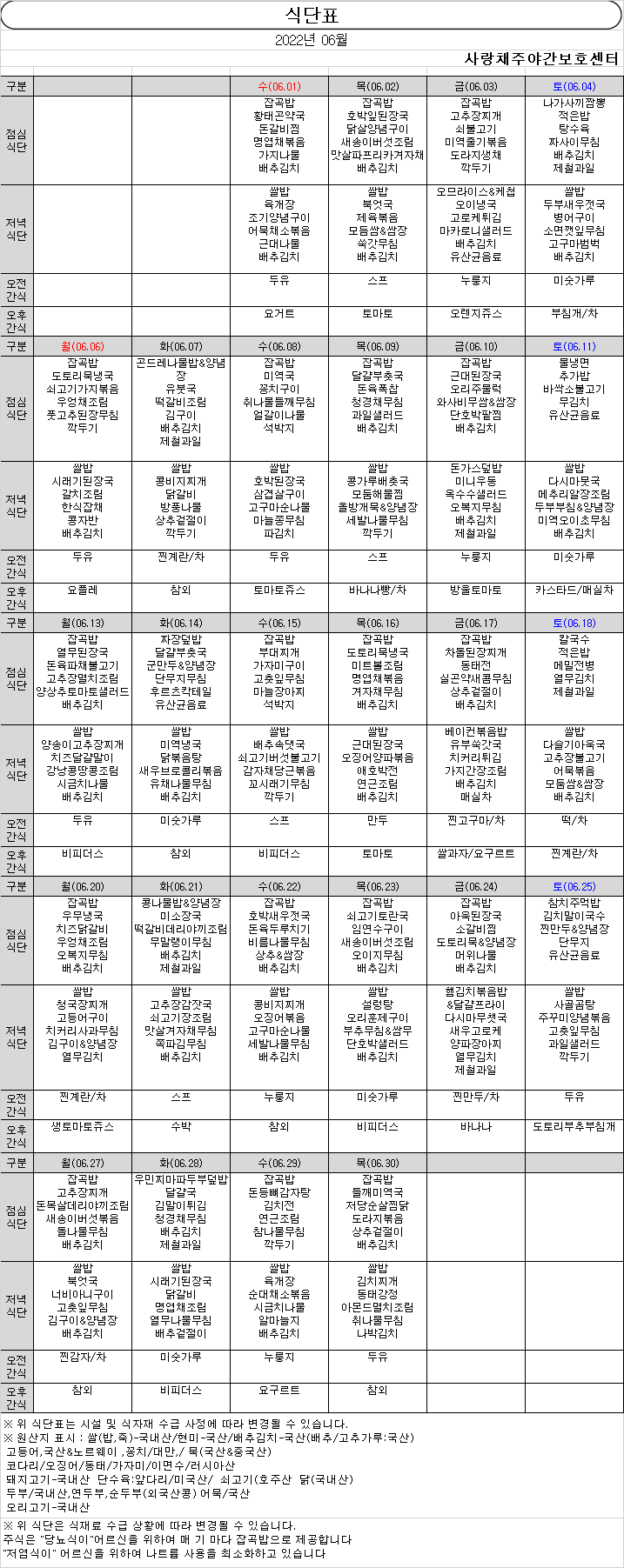 2022년 06월 식단표 및 프로그램계획표 페이지 정보 작성자 관리자 댓글 0건 조회 49회 작성일 2022-06-01 본문 2022년 06월 식단표 및 프로그램계획표 목록 목록 이전글2022년 07월 식단표 및 프로그램계획표 23.08.13 다음글2022년 05월 식단표 및 프로그램계획표 23.08.13 댓글 0 댓글목록 등록된 댓글이 없습니다.