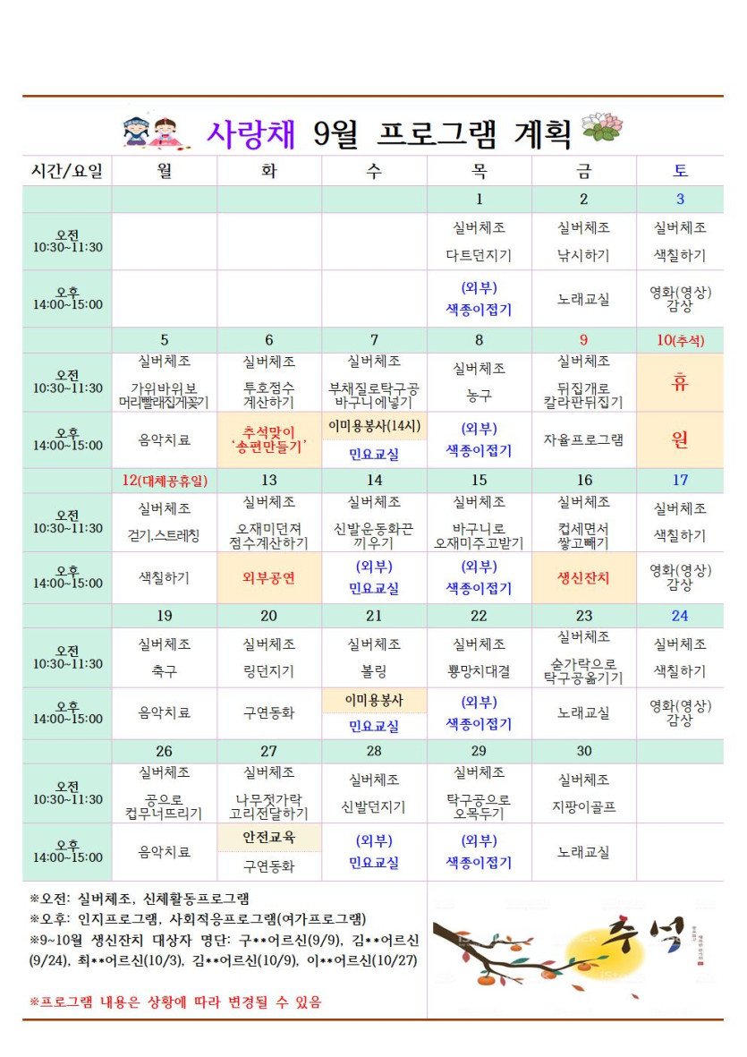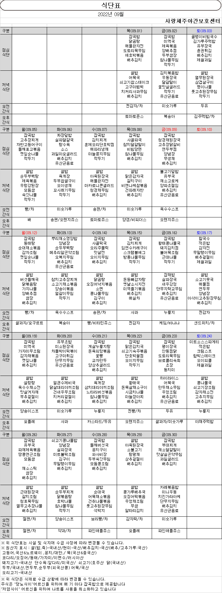 2022년 09월 식단표 및 프로그램계획표 페이지 정보 작성자 관리자 댓글 0건 조회 50회 작성일 2022-09-01 본문 2022년 09월 식단표 및 프로그램계획표 목록 목록 이전글2022년 10월 식단표 및 프로그램계획표 23.08.13 다음글2022년 08월 식단표 및 프로그램계획표 23.08.13 댓글 0 댓글목록 등록된 댓글이 없습니다.